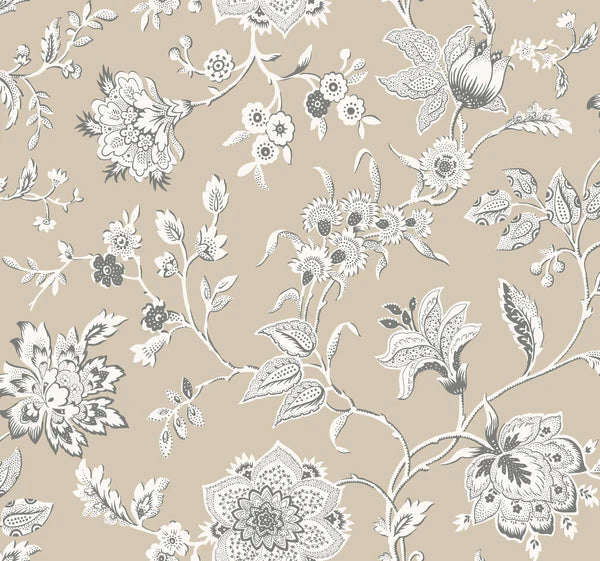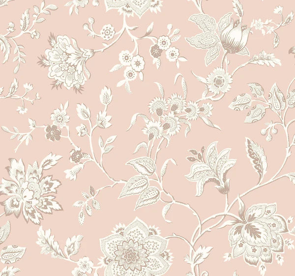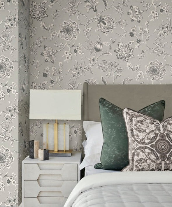 The refined Jacobean block print of pattern Sutton is detailed in white and dark blue along a steel blue background.